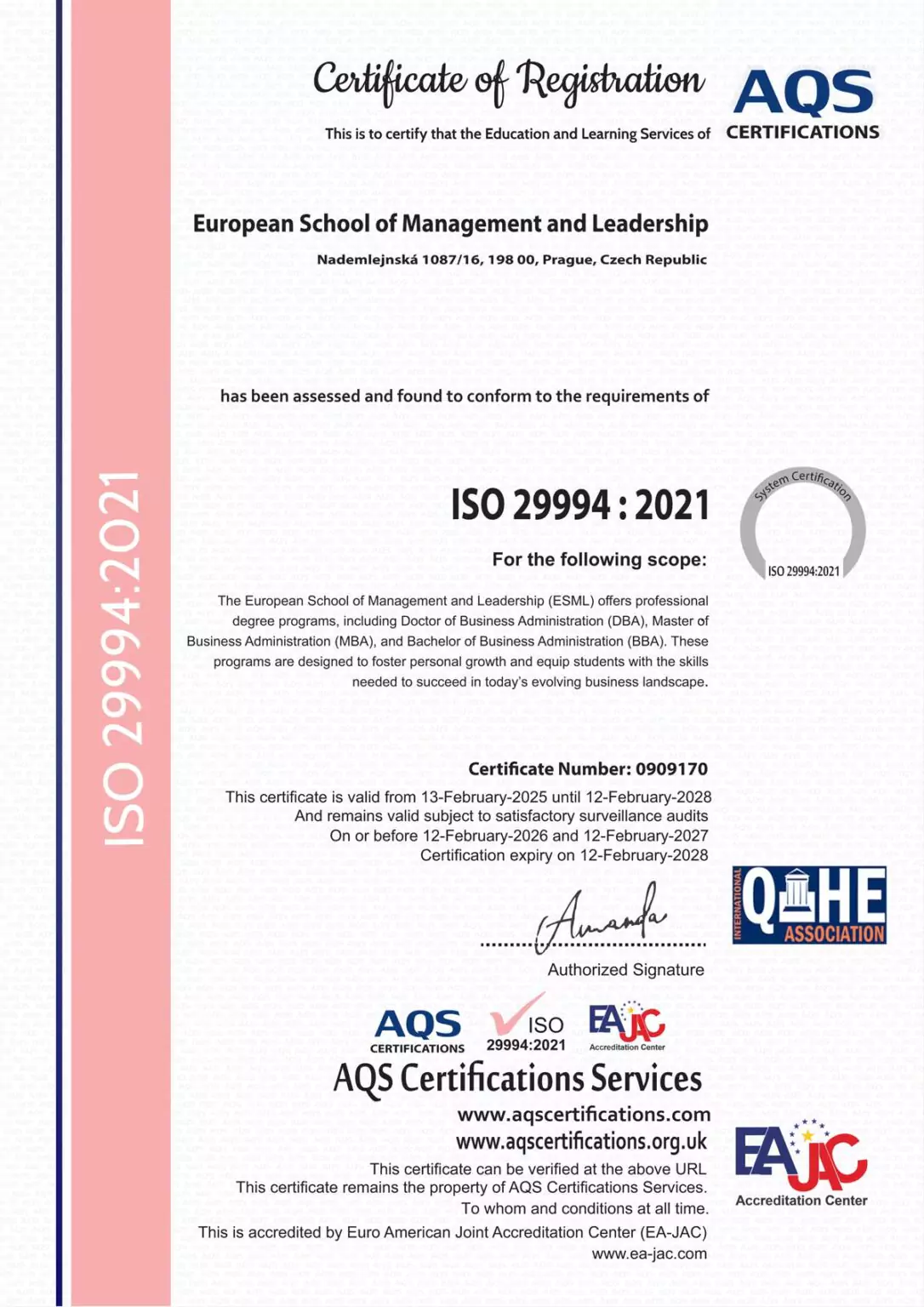 The European School of Management and Leadership (ESML) has successfully achieved ISO certification, demonstrating its commitment to excellence in education, quality management, and international standards. This certification reflects ESML’s dedication to providing high-quality academic programs, ensuring continuous improvement, and maintaining best practices in institutional operations. By meeting ISO standards, ESML strengthens its credibility and reinforces its mission to deliver world-class education and leadership training to students and professionals globally.